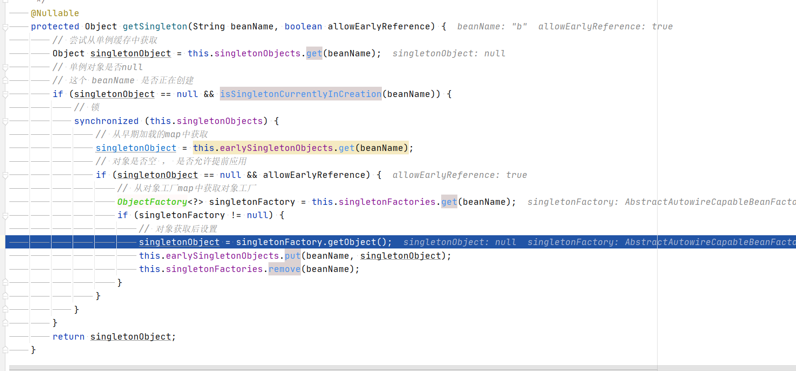现在获取到了B对象,但是属性还没有设置, 此时还会继续调用getSingleton 和 doCreateBean