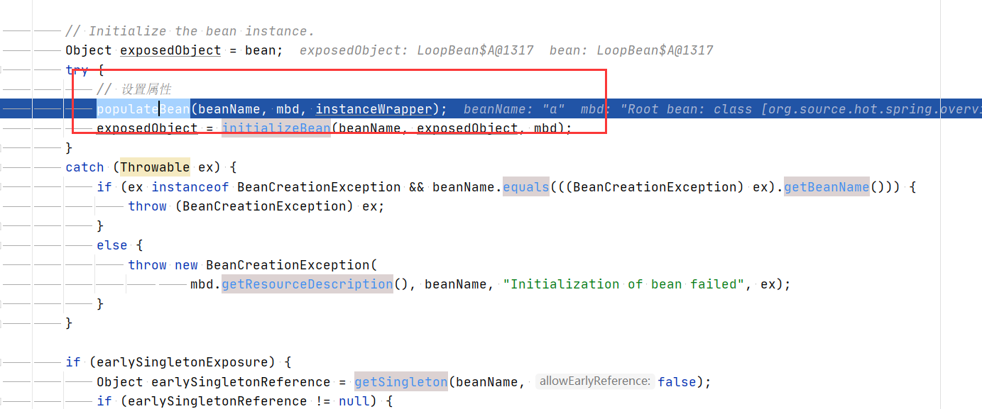 这里进行属性设置, 在属性设置的时候会调用 getSingleton , 在这里处理了循环依赖。在看代码之前先看几个变量