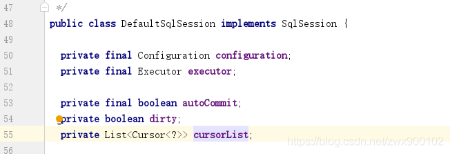 是的,自然是存储在SqlSession内是最合适的,那我们来看看SqlSession的唯一实现类DefaultSqlSession: