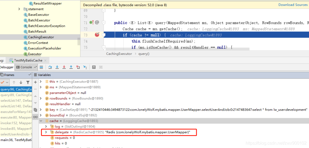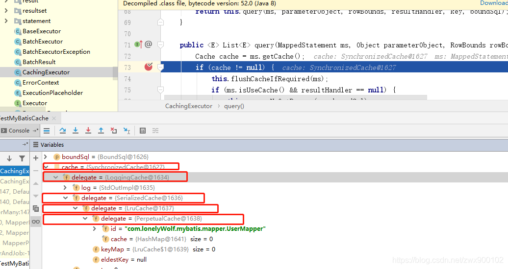 最开始我们提到了一些缓存的包装类,这些都到底有什么用呢?在回答这个问题之前,我们先断点一下看看获取到的二级缓存长啥样:
