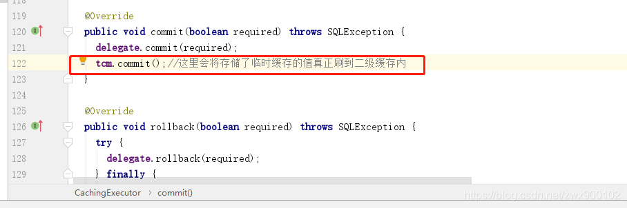 需要注意的是在事务提交之前,并不会真正存储到二级缓存,而是先存储到一个临时属性,等事务提交之后才会真正存储到二级缓存。这么做的目的就是防止脏读。因为假如你在一个事务中修改了数据,然后去查询,这时候直接缓存了,那么假如事务回滚了呢?所以这里会先临时存储一下。所以我们看一下commit方法: