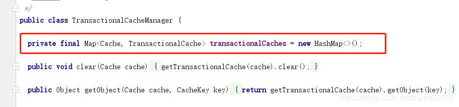 TransactionalCacheManager内部非常简单,也是维护了一个HashMap来存储缓存。HashMap中的value是一个TransactionalCache对象,继承了Cache。