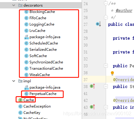 需要注意的是decorators包下面的所有类也实现了Cache接口,那么为什么我还是要说Cache只有一个实现类呢?其实看名字就知道了,这个包里面全部是装饰器,也就是说这其实是装饰器模式的一种实现。