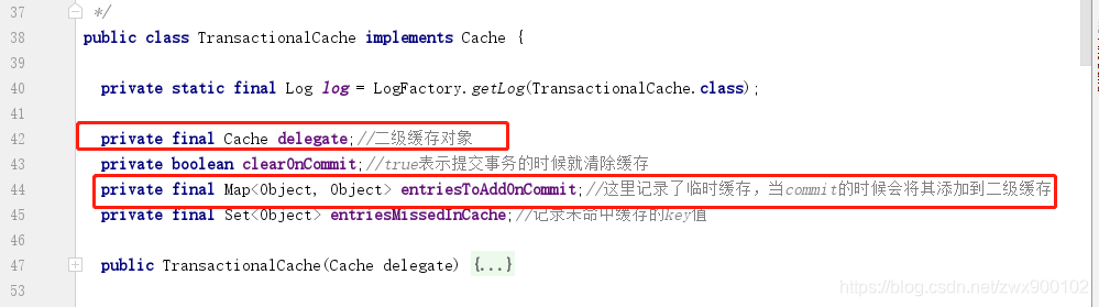 我们看到CachingExecutor中只有2个属性,第1个属性不用说了,因为CachingExecutor本身就是Executor的包装器,所以属性TransactionalCacheManager肯定就是用来管理二级缓存的,我们再进去看看TransactionalCacheManager对象是如何管理缓存的: