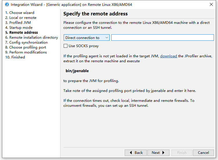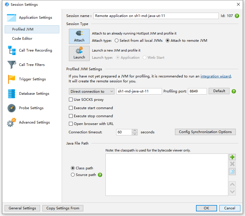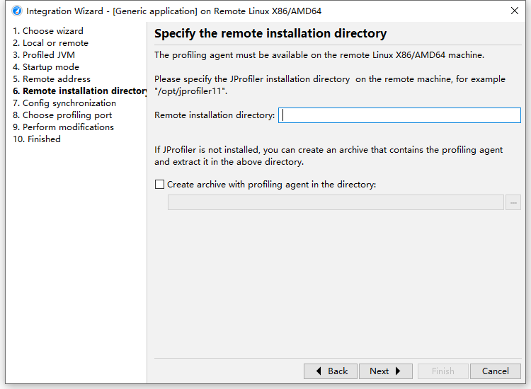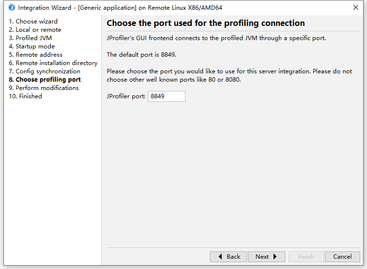 - 在被分析的jvm 的启动参数增加下面内容:-agentpath:/opt/jprofiler11/bin/linux-x64/libjprofilerti.so=port=8849