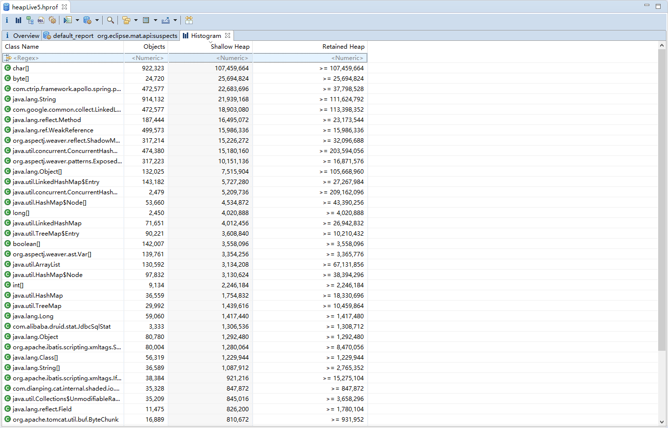 - Retained Heap :是shallow Heap的总和,也就是该对象被GC之后所能回收到内存的总和
