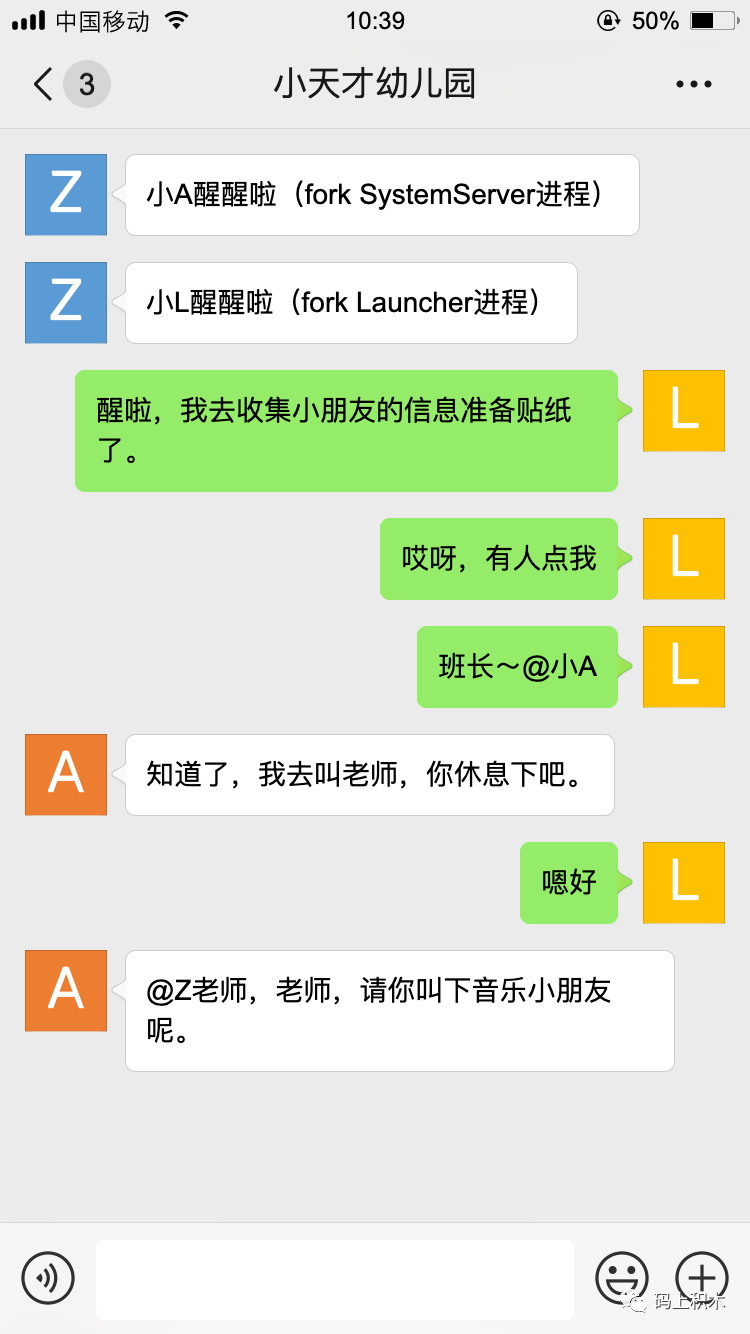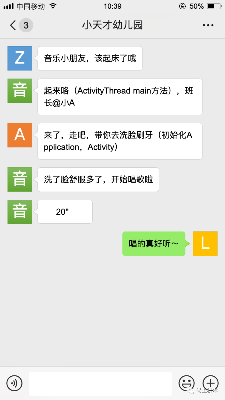 这时候你要点开一个音乐小朋友呢(startActivity),小L就会通知班长小A(Binder),小A知道了之后,让小L自己休息下(Paused),然后就去找Z老师了。Z老师就负责叫音乐小朋友起床了(fork进程,启动ActivityThread),音乐小朋友起来后就又找小A带她去洗脸刷牙(启动ApplicationThread,Activity),都弄完了就可以进行各种表演了,唱歌啊,跳舞啊。