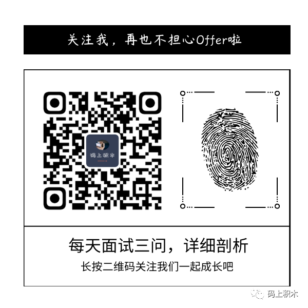 “我的公众号:码上积木,每天三问面试题,详细剖析,助你成为offer收割机。
