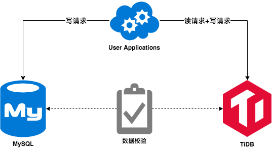 第二步,业务方改造程序,对 MySQL 和 TiDB 进行双写,断开 DM 同步。业务方将 TiDB 作为主库直接读写,但仍然保留了 MySQL 中的数据写入,将 MySQL 作为 TiDB 发生异常之后的降级方案。这个阶段持续了 2 个季度左右。在这期间读写 TiDB 的程序运行正常,每天的数据校验保持一致。