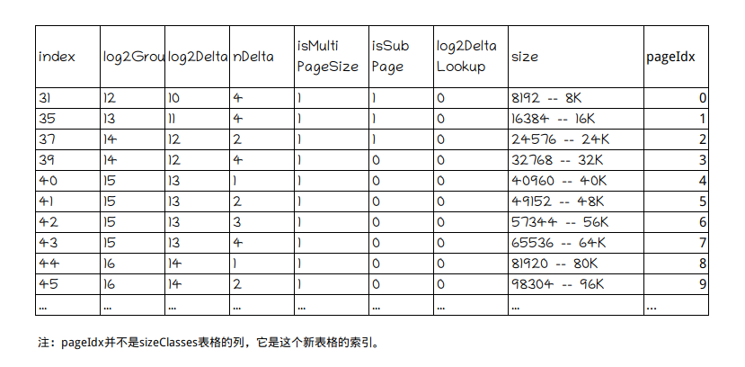 | index | log2Group | log2Delta | nDelta | isMultiPageSize | isSubPage | log2DeltaLookup | size | usize |