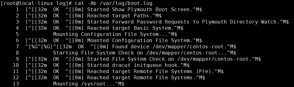 用于查看文件,例如查看Linux启动日志文件文件,并标明行号:
