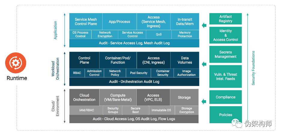 云原生运行环境应提供策略和资源限制功能。对工作负载进行运行时资源限制(例如 Linux 的 cgroup 隔离)就是一个在云原生环境中进行限制和可观察性的原语的例子。可以把云原生运行时环境分解为具备不同安全问题的关联的组件层(例如硬件、主机、容器镜像运行时和编排)。