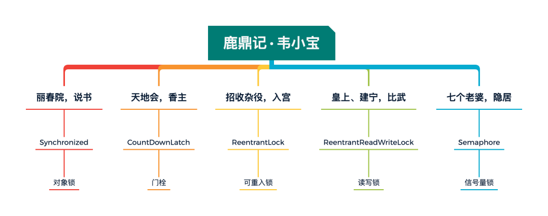 在鹿鼎记的场景中我们串进去了各个多线程的使用案例,分别包括不同锁: Synchronized、CountDownLatch、ReentrantLock、ReentrantReadWriteLock、Semaphore。 -
