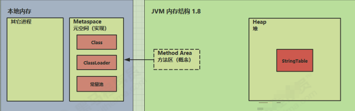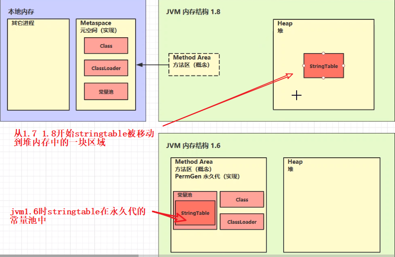 在JVM1.6之前stringtable在方法区,具体实现也就是永久代的其中一块空间 而在1.7 1.8之后 他的实现空间被移动到堆内存中