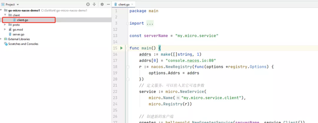 1、创建 client.go (为了方便演示本文章在同一项目下创建了 cient.go)。