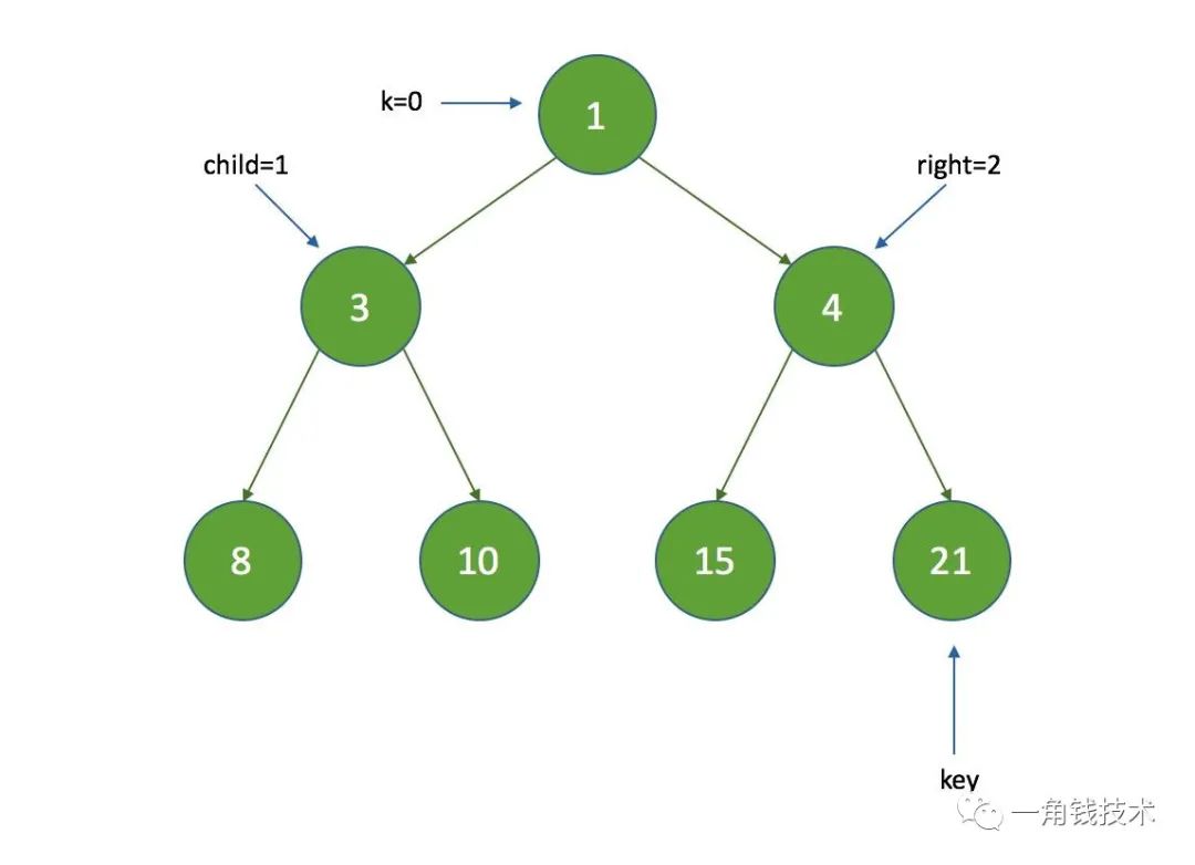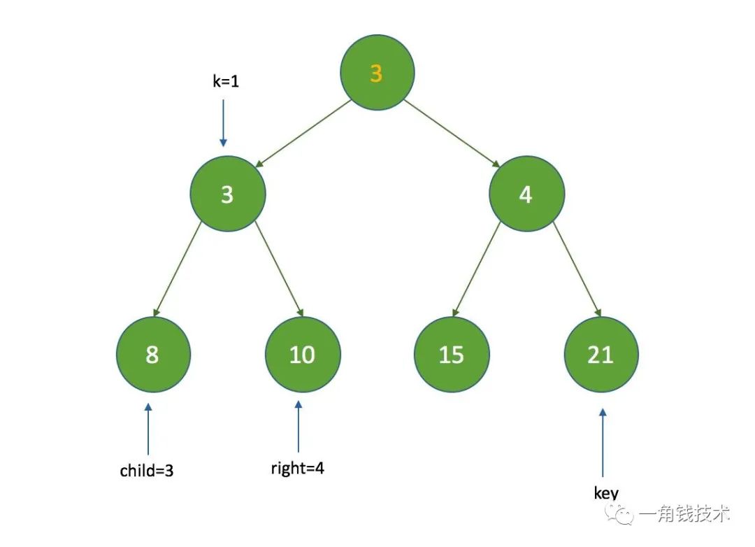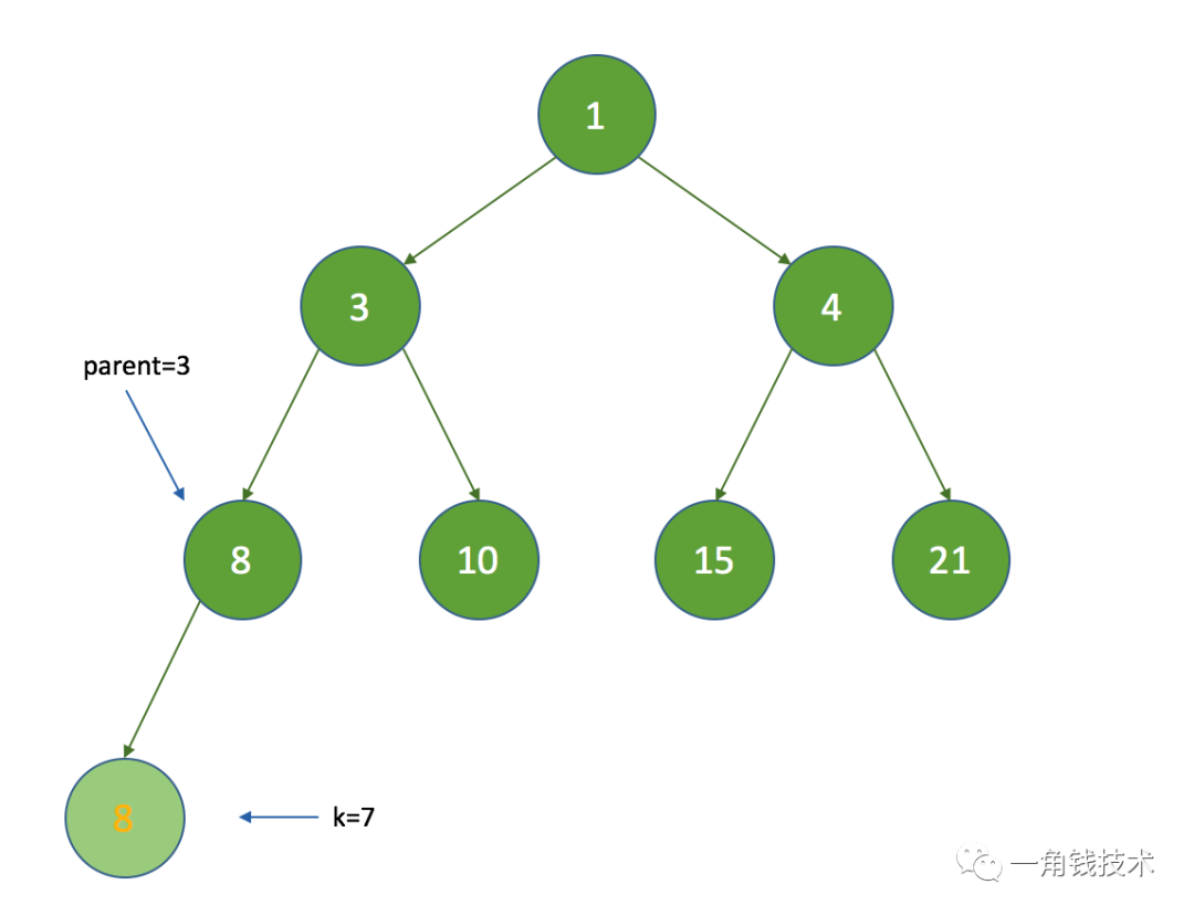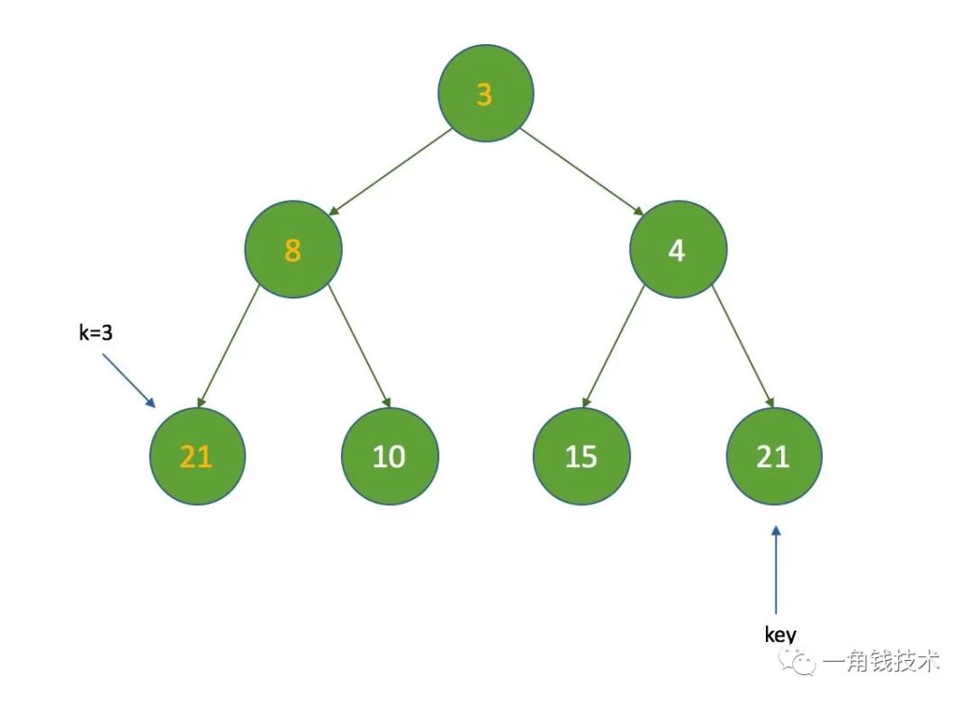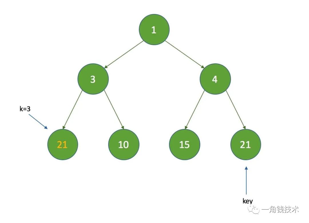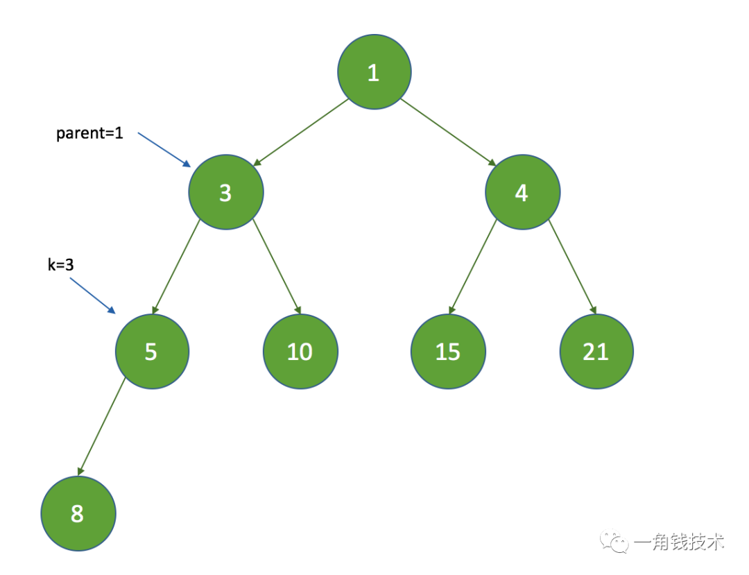 假设 k = 3 ,那么 k = half ,没有子节点,在执行siftDown方法时直接把索引为3的节点设置为数组的最后一个节点:
