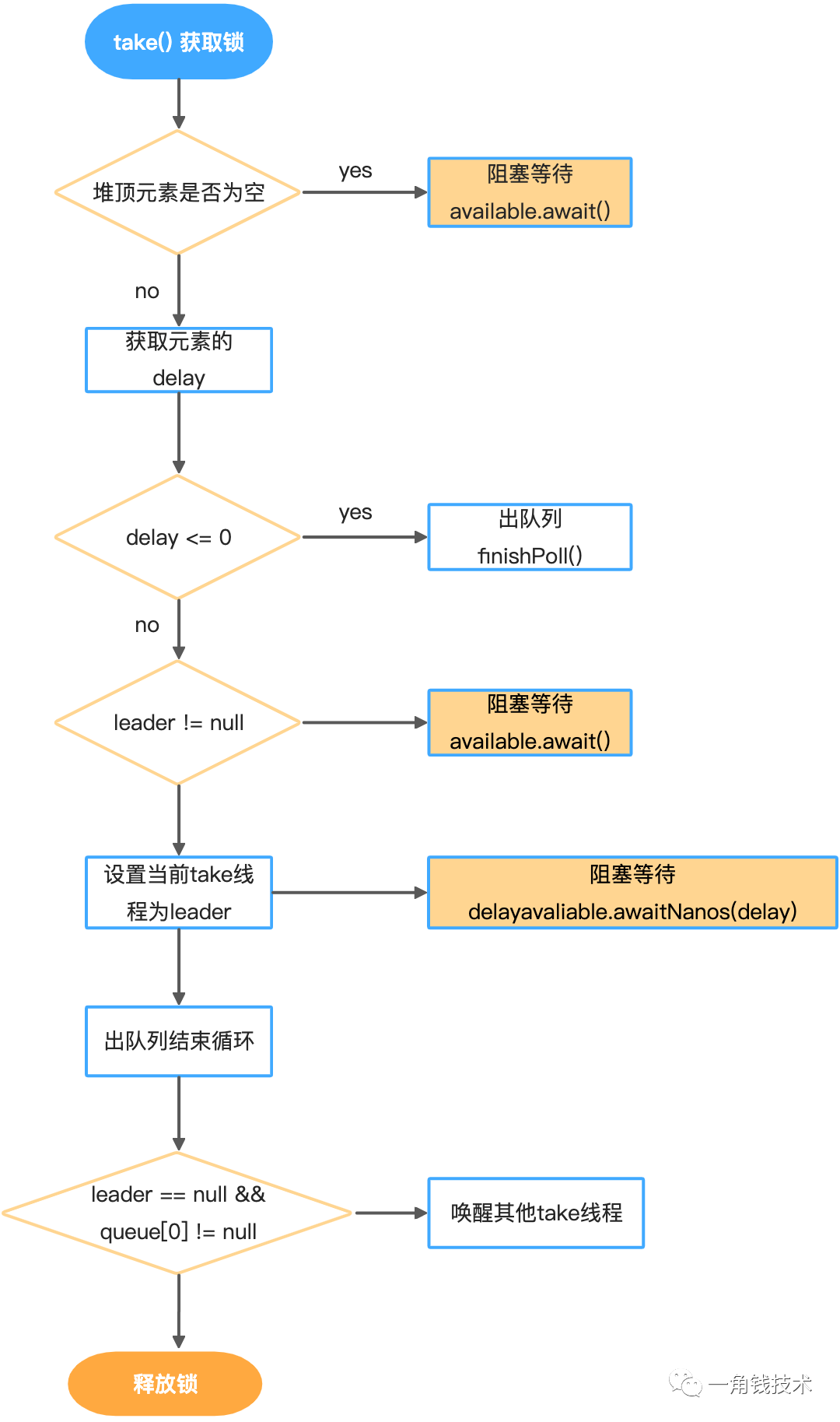 DelayedWorkQueue 消费元素take,在堆顶元素为空和delay >0 时,阻塞等待; -