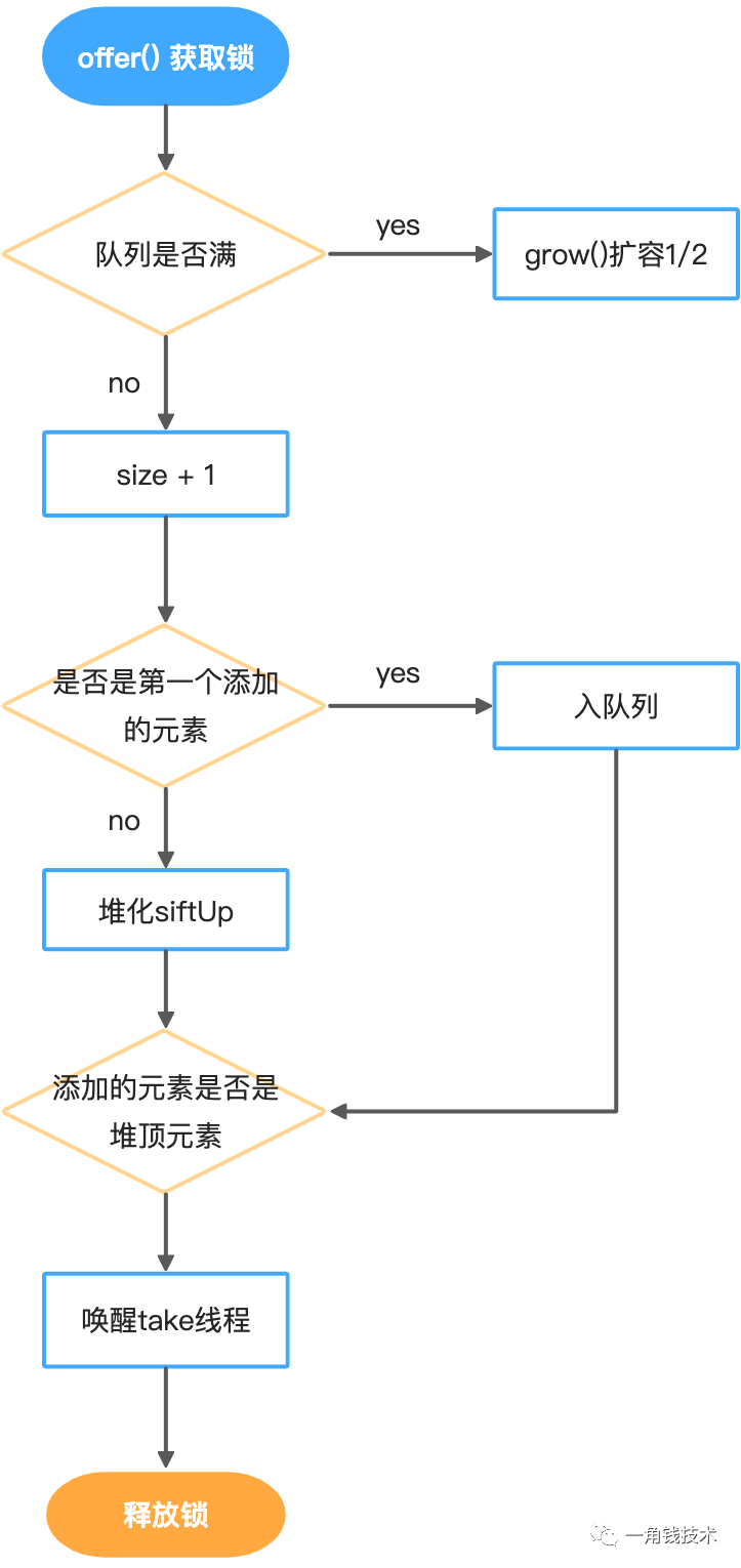 如果堆顶元素刚好是此时被添加的元素,则唤醒take线程消费。 -