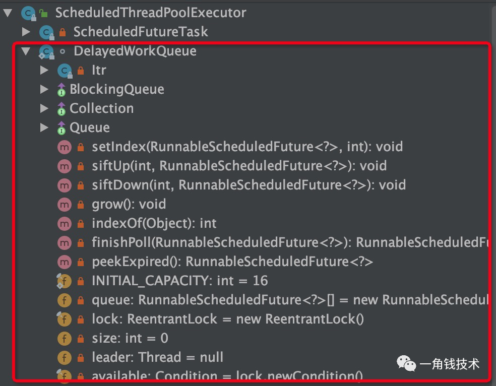 DelayedWorkQueue 也是一种设计为定时任务的延迟队列,它的实现和DelayQueue一样,不过是将优先级队列和DelayQueue的实现过程迁移到本身方法体中,从而可以在该过程当中灵活的加入定时任务特有的方法调用。