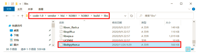 - 下载文末附件中的 libdtpython.a,并将其拷贝到 \code-1.0\vendor\hisi\hi3861\hi3861\build\libs 目录下,如图: