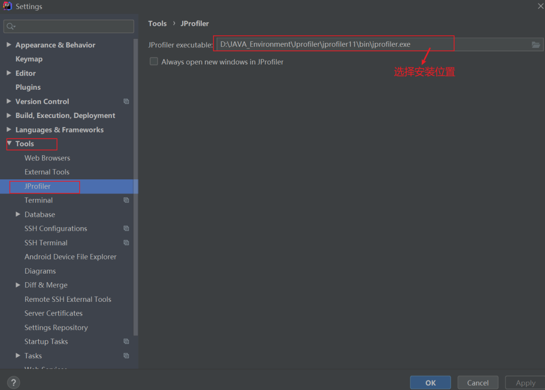 打开IDEA的设置,找到Tools里面的JProfiler,没有设置位置则设置位置