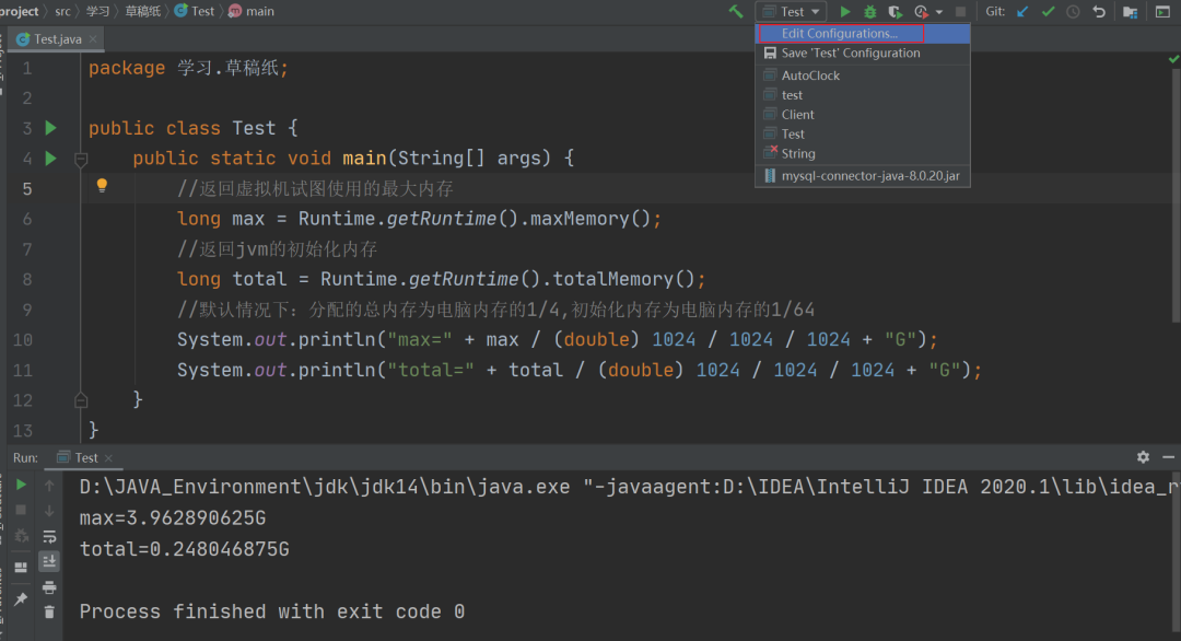 //默认情况下:分配的总内存为电脑内存的1/4,初始化内存为电脑内存的1/64