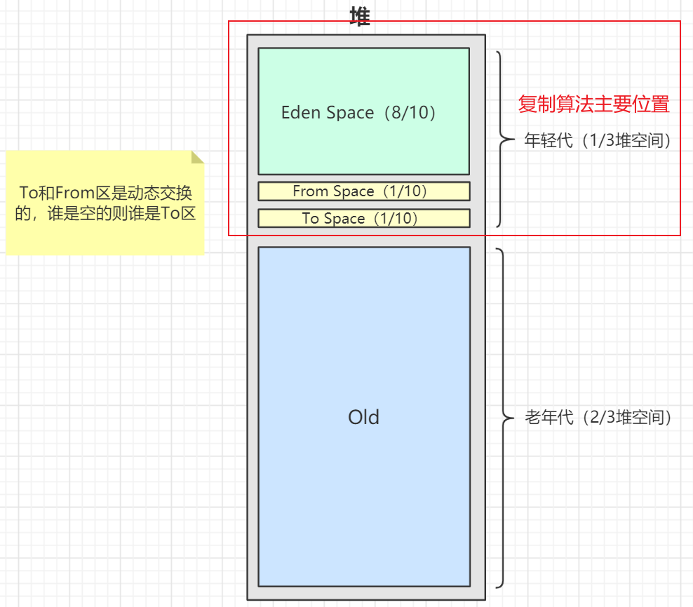 复制算法,其中一个区域会将存活的对象转移到令一个区域去,然后将自己区域的内存空间清空,这样该区域为空,又成为了To Space;所以每次触发