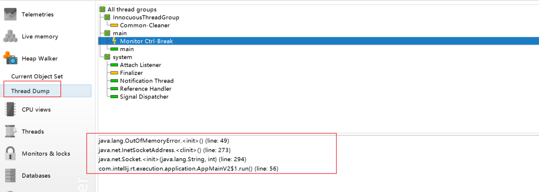 点击Thread Dump,里面是所有的线程,点击对应的线程可以看到相应的错误,反馈到具体的行,便于排错