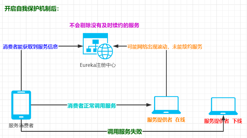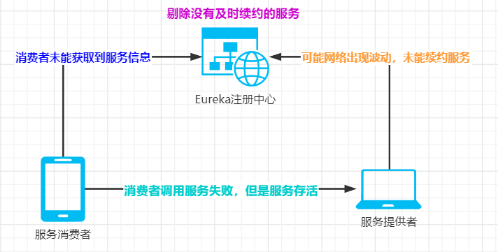 但是在某些时候,遇到网络分区故障,服务节点实际上是正常存货状态,但是却无法和Eureka Server正常通信,此时如果没有引入自我保护机制,Eureka Server就会将该服务节点剔除。
