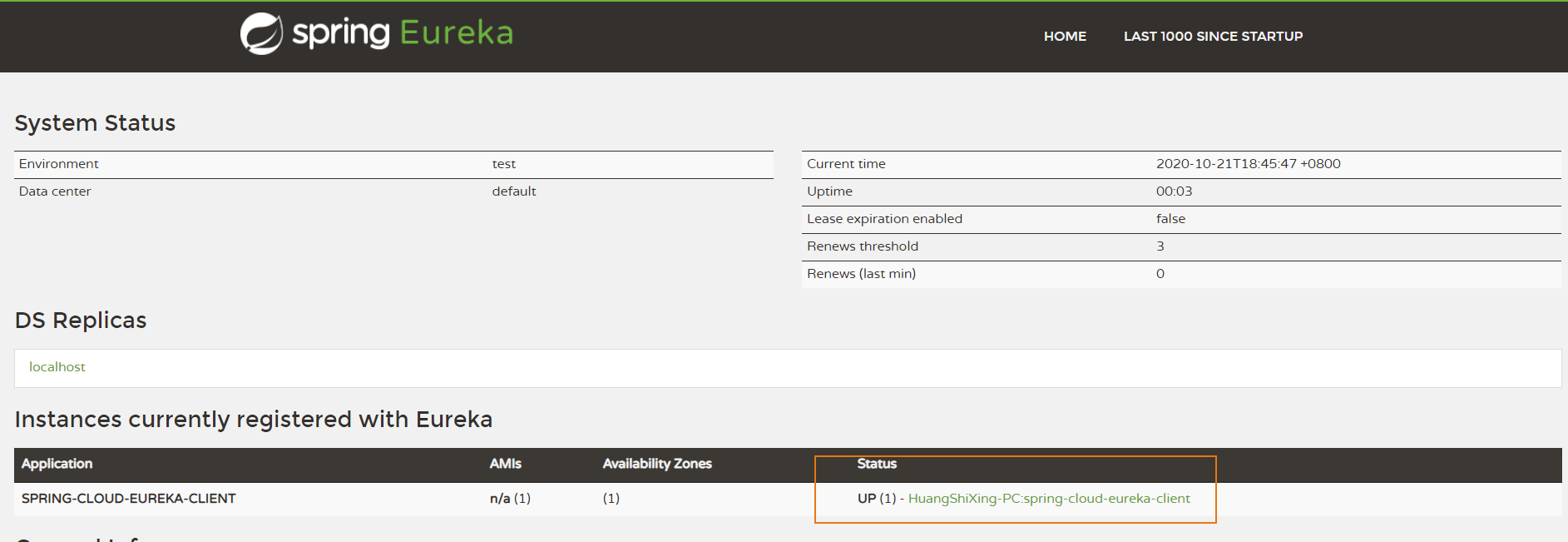 启动客户端,然后刷新刚刚打开的Eureka主页,我们发现服务已经注册成功。