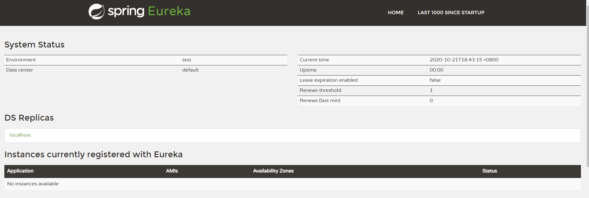 5.启动项目,然后访问http://localhost:8761/,可以看到 Eureka 的管理页面,表示 Eureka 启动成功了。