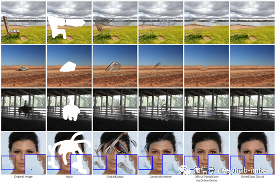 图4给出了不同深度图像补绘方法的定性比较。很明显,提出的模型(GatedConv)在视觉质量方面优于所有其他方法。您可以看到,该方法提供了不明显的颜色不一致的inpaint结果。