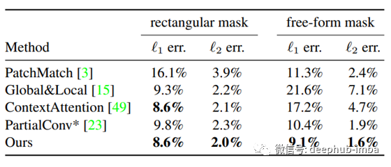 表1列出了两个供读者参考的客观评价度量数。正如我在之前的文章中提到的,对于深图像的补绘,目前还没有一个好的定量评估指标。因此,这些数字仅供参考,你应该关注填充图像的视觉质量。正如您所看到的,所提出的模型提供了最低的l1和l2误差。