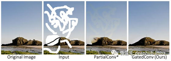其次,之前的方法通常将掩码图像和掩码图像输入生成器网络完成。如果我们还允许用户的草图输入作为任务的附加条件呢?生成器知道如何区分用户的草图输入和掩码图像输入吗?一个简单的答案,使用门控卷积(PConv的一个可学习的版本)就可以了!
