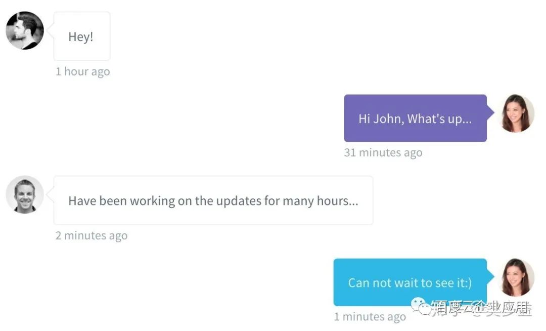在企业应用里甚至可以简化成表格展现,第一列是时间,第二列是用户名,第三列是文本,虽然展现差了很多,功能却是一样的。