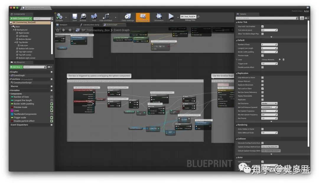 很多低代码平台使用的是第 2 种方式,这种方式看起来最符合低代码平台的定义,也看起来最高大上,以 UE4 里的蓝图为例,这是我见过最复杂的可视化代码编辑器,可以用它来编写着色器和控制游戏流程:
