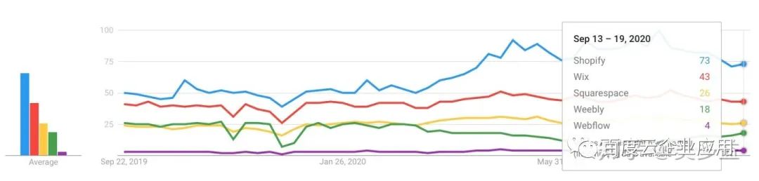 然而继续调研却发现,在几个建站产品里 webflow 恐怕是商业方面最差的,虽然从 google trends 看和其它竞品有数量级的差距。