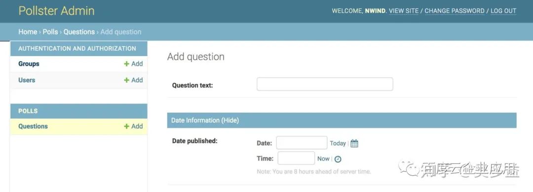 有了这个定义,Django admin 插件就会自动生成管理后台页面,比如下面是新增一个问题的表单:
