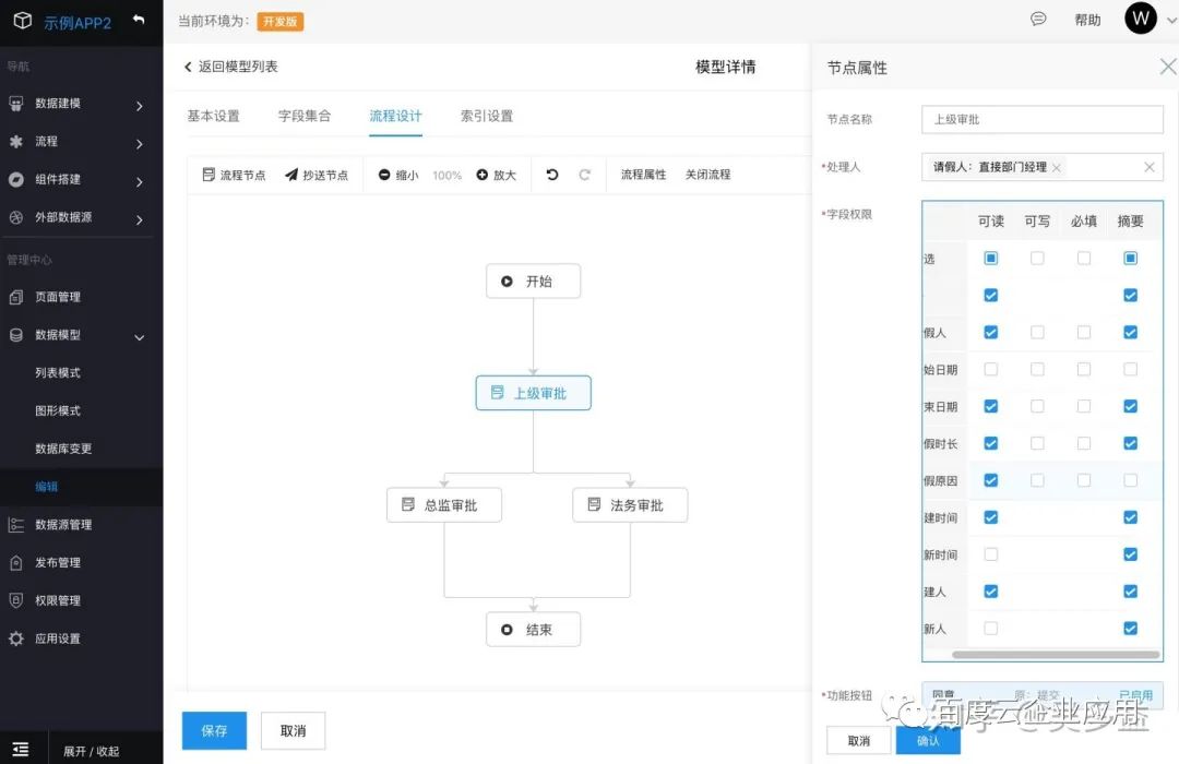 流程也是低代码平台中的常用功能,比如用可视化方式设计审批流: