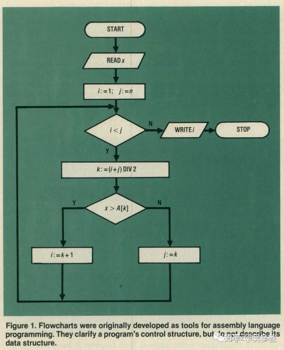 这本书里预言的是 10 年内不会有突破性进步,然而过了 34 年的今天也没见明显进步,1985 年 Raeder 在他的文章里告诉我们流程图最早是给汇编语言用的,因为汇编代码里都是跳来跳去的,看着容易晕,有这样的图可以看起来更清晰: