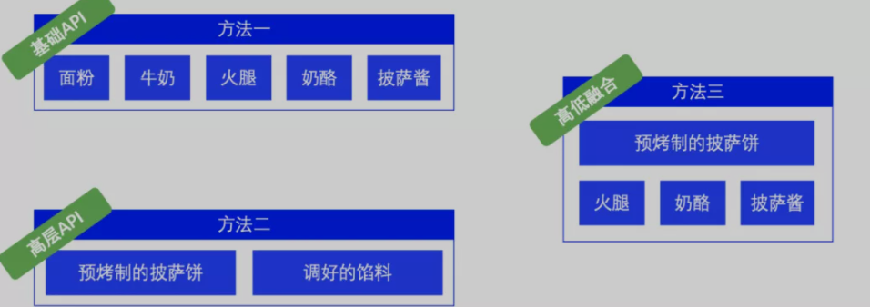 那么,用框架来类比,飞桨框架基础API对应方法一,飞桨框架高层API对应方法二。使用基础API,我们可以随心所欲的搭建自己的深度学习模型,不会受到任何限制;而使用方法二,我们可以很快的实现模型,达到自己想要的效果,缺点是少了一些自主性。但是,与制作披萨不同的是,飞桨框架可以做到真正的”鱼与熊掌”可以兼得,我们在飞桨框架中实现了API的高低融合,使我们的开发者既可以享受到基础API的强大,又可以兼顾高层API的快捷。
