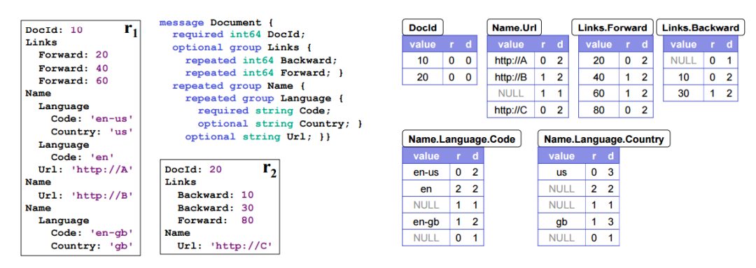 对于Name.Url这一列,r1中它有三个值,分别为url1=’http://A‘,它是r1中该列的第一个值并且是定义的,所以R=0,D=2;value2=’http://B‘,和上一个值value1在Name这一层是不相同的,所以R=1,D=2;value3=NULL,和上一个值value2在Name这一层是不相同的,所以R=1,但它是未定义的,而Name这一层是定义的,所以D=1。r2中该列只有一个值value3=’http://C‘,R=0,D=2.