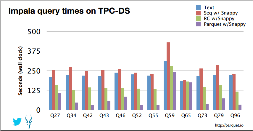 上图展示了Twitter在Impala中使用不同格式文件执行TPC-DS基准测试的结果,测试结果可以看出Parquet较之于其他的行式存储格式有较明显的性能提升。