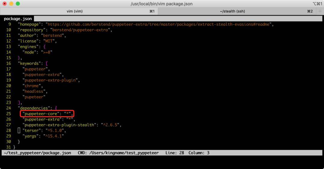 此时,你需要把它的package.json和index.js两个文件保存到本地。然后打开package.json文件,修改其中的dependencies这一项,把里面的puppeteer改成puppeteer-core,如下图所示: