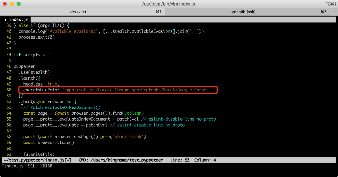 然后修改index.js,给.launch()函数增加一个参数executablePath,指向你电脑上的 Chrome 浏览器,如下图所示: