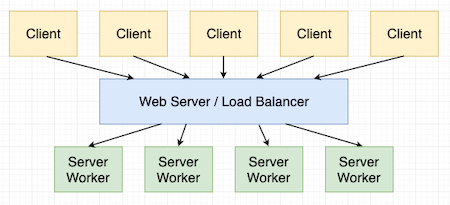 在这种情况下,我们有 5 台客户端,都向应用程序发送请求。这个应用程序的访问入口是一个 Web 服务器,通过将服务分配给一个服务器 worker 池来充当负载均衡器,这些 worker 可以实现为进程、线程或者两者的结合。这些 worker 执行负载均衡器分配给他们的请求。你使用 Web 应用程序框架(例如 Flask 或 Django)编写的应用程序逻辑运行在这些 worker 中。