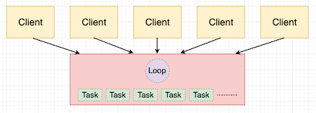这种类型的服务器运行在单个进程中,通过循环控制。这个循环是一个非常有效率的任务管理器和调度器,创建任务来执行由客户端发送的请求。与长期存在的服务器 worker 不同,异步任务是由循环创建,用来处理某个特定的请求,当那个请求完成时,该任务也会被销毁。任何时候,一台异步服务器都会有上百或上千个活跃的任务,它们都在循环的管理下执行自己的工作。