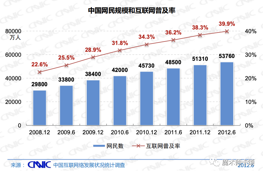 根据第30次《中国互联网络发展状况统计报告》[2],截止12年6月,我国互联网普及率达到39.9% 。