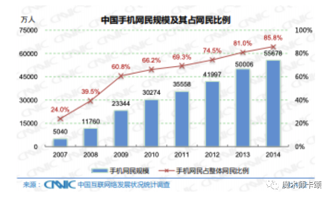 根据第35次中国互联网络发展状况统计报告[4],截止2014年,中国手机网民规模达到85.8%,伴随着4G普及,中国正式进入移动互联网时代。