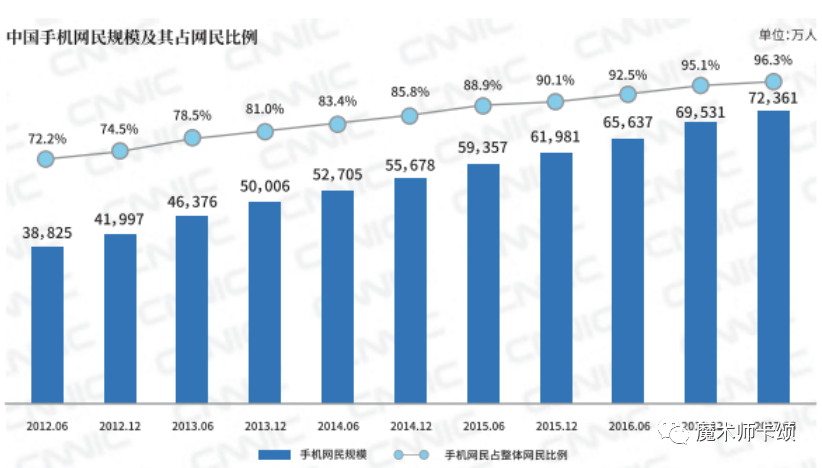 根据第40次中国互联网络发展状况统计报告[5],手机网民规模已经由12年的72%提升到17年的96% ,移动互联网进入存量市场。